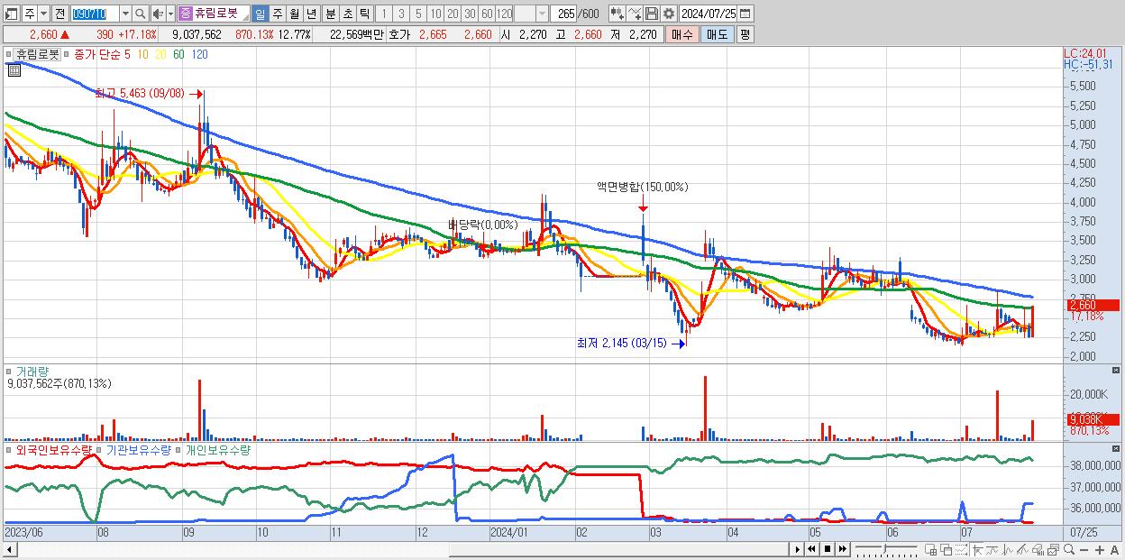 - 휴림로봇 (2,660원 ▲ 17.18% , 시총: 1,883억, 거래량: 9,037,562, 거래대금:226억)