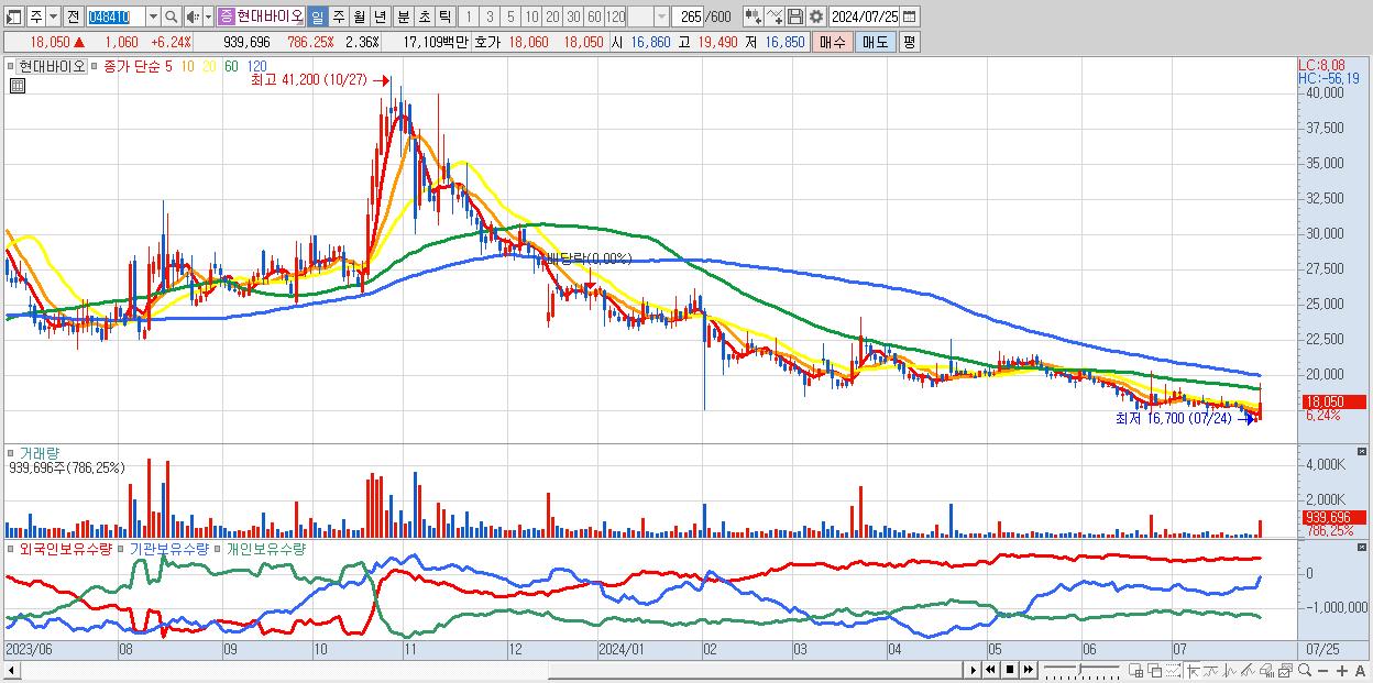 - 현대바이오 (18,050원 ▲ 6.24% , 시총: 7,188억, 거래량: 939,696, 거래대금:171억)