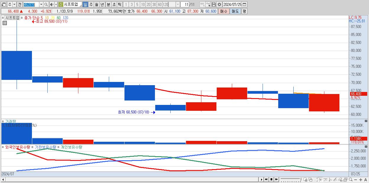 - 시프트업 (66,400원 ▲ 6.92% , 시총: 38,529억, 거래량: 1,133,519, 거래대금:737억)