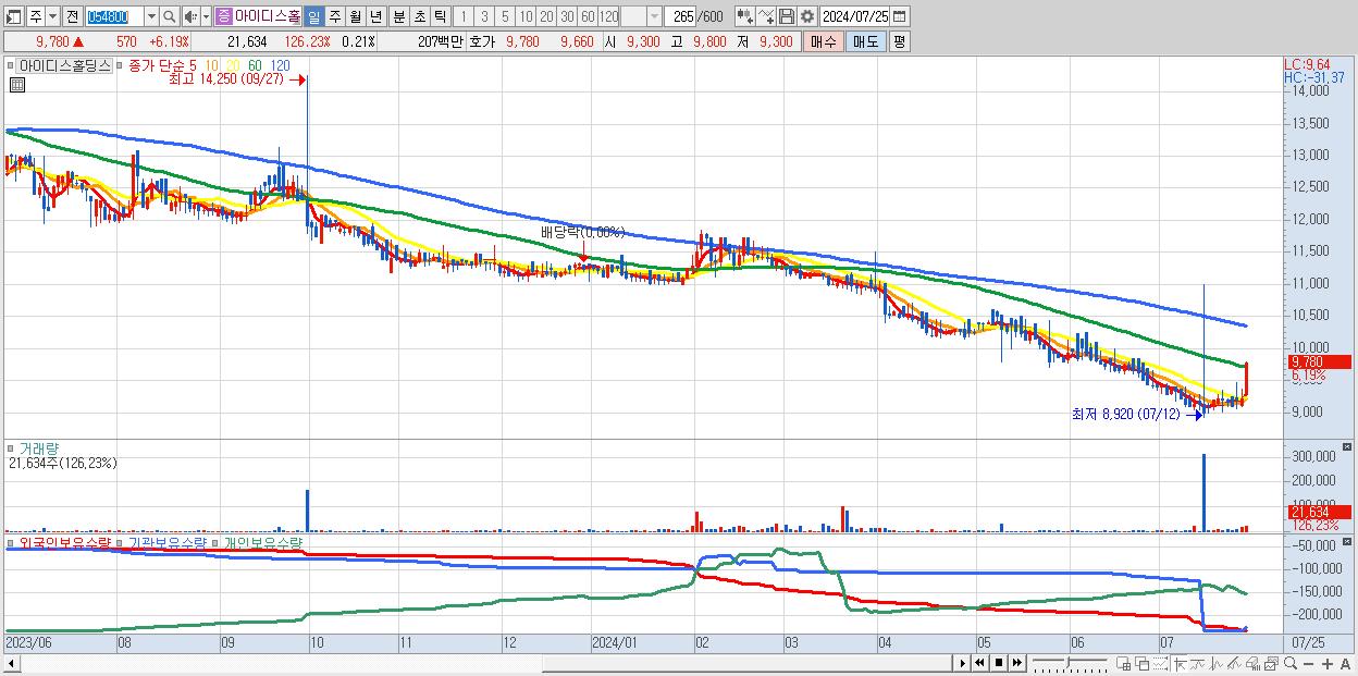 - 아이디스홀딩스 (9,780원 ▲ 6.19% , 시총: 1,012억, 거래량: 21,634, 거래대금:2억)