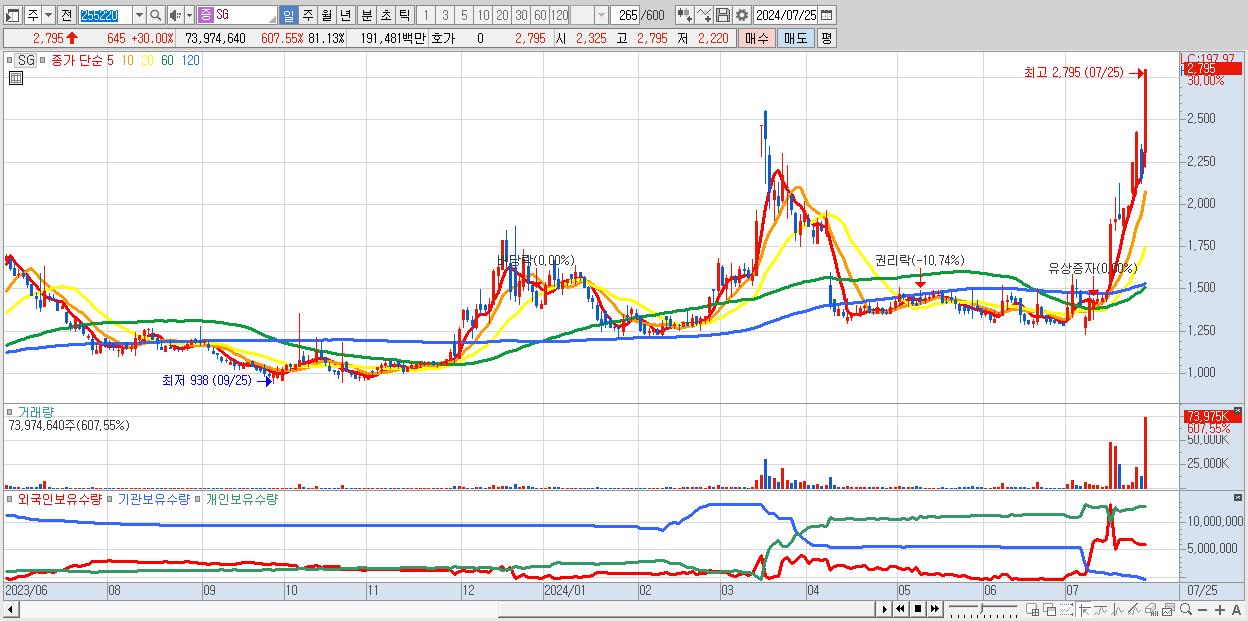 - SG (2,795원 ▲ 30% , 시총: 2,548억, 거래량: 73,974,640, 거래대금:1,915억)