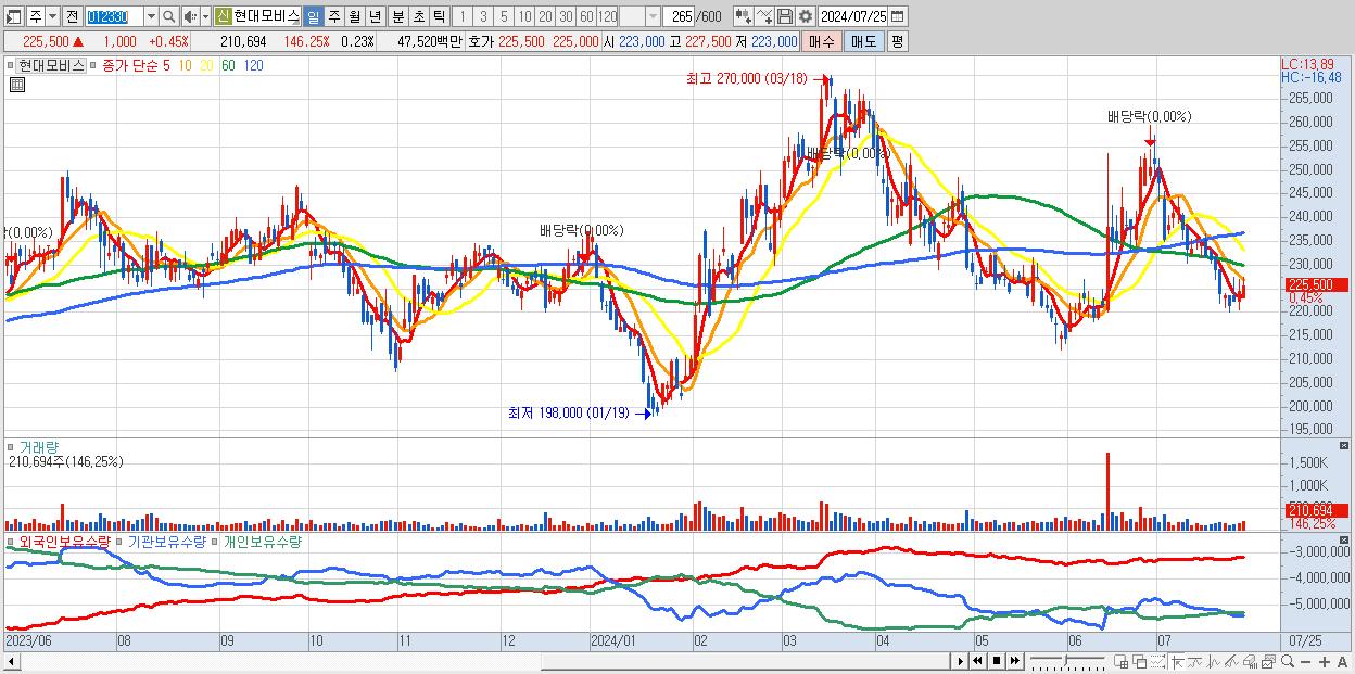 - 현대모비스 (225,500원 ▲ 0.45% , 시총: 209,704억, 외국인 순매수 거래금:77억)
