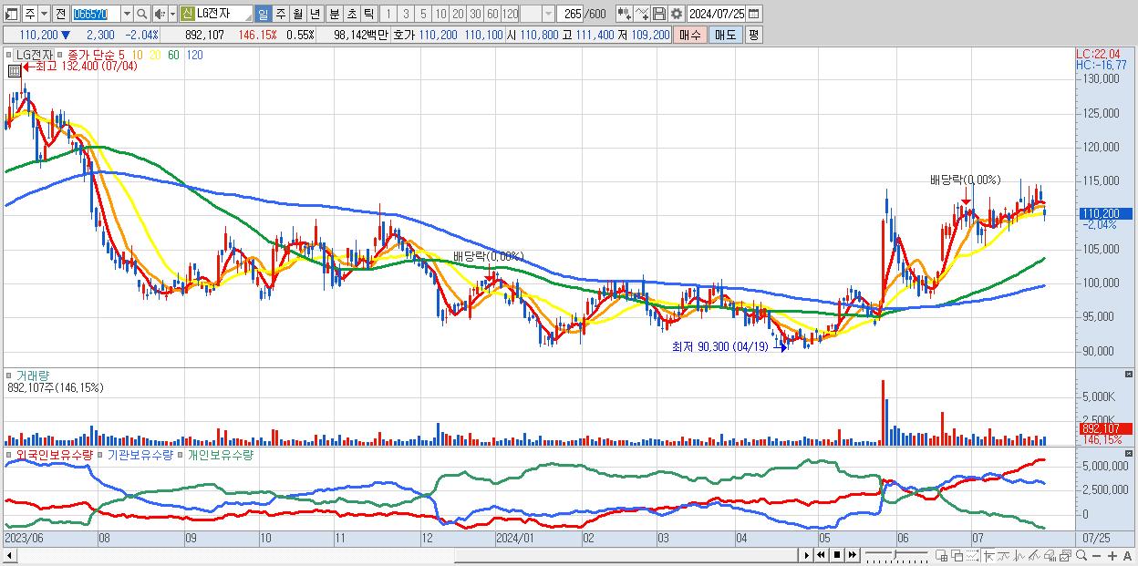 - LG전자 (110,200원 ▼ -2.04% , 시총: 180,340억, 외국인 순매수 거래금:242억)