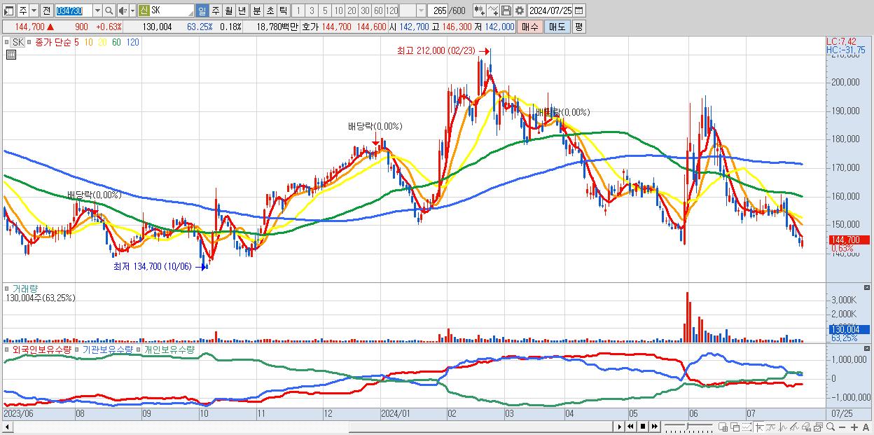 - SK (144,700원 ▲ 0.63% , 시총: 104,911억, 외국인 순매수 거래금:62억)
