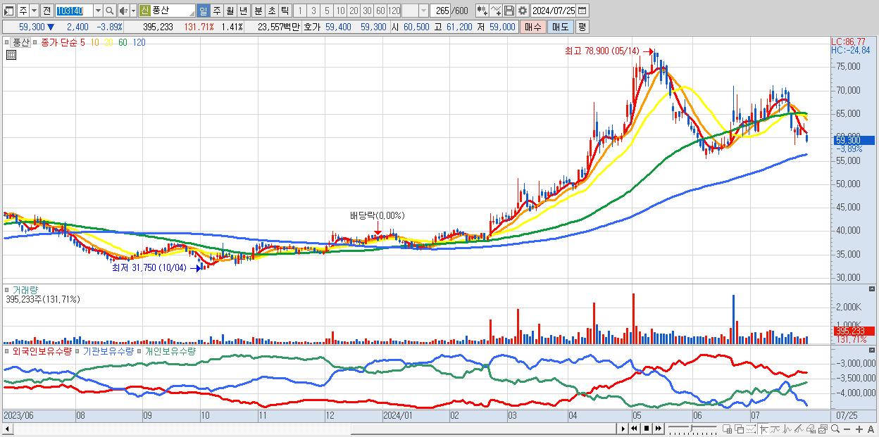 - 풍산 (59,300원 ▼ -3.89% , 시총: 16,618억, 외국인 순매수 거래금:57억)