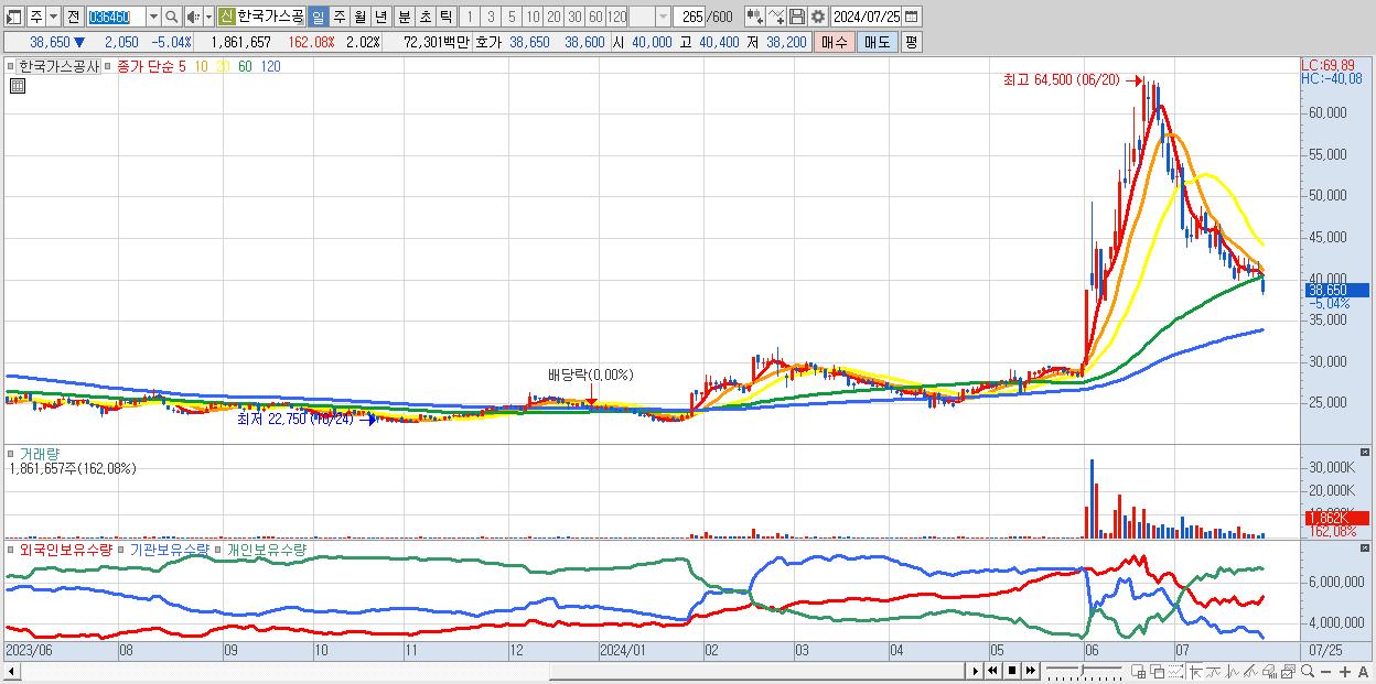 - 한국가스공사 (38,650원 ▼ -5.04% , 시총: 35,679억, 외국인 순매수 거래금:120억)