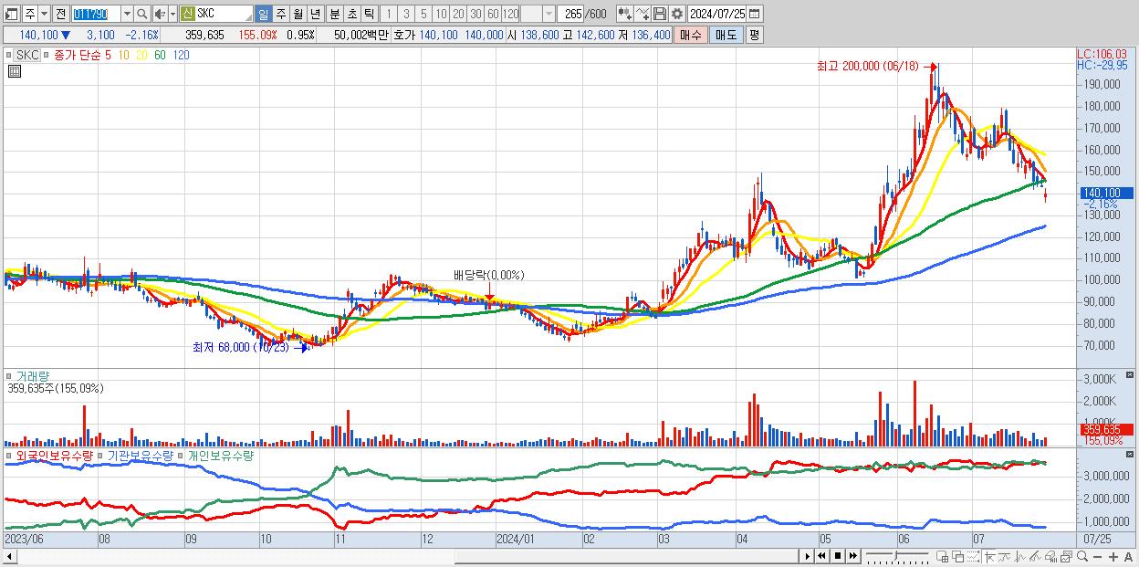 - SKC (140,100원 ▼ -2.16% , 시총: 53,053억, 외국인 순매수 거래금:103억)