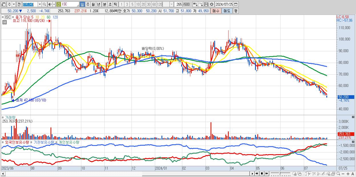 - ISC (50,200원 ▼ -4.74% , 시총: 10,641억, 외국인 순매수 거래금:52억)