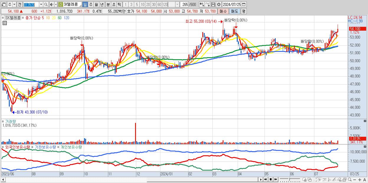 - SK텔레콤 (54,100원 ▲ 1.12% , 시총: 116,201억, 외국인 순매수 거래금:147억)