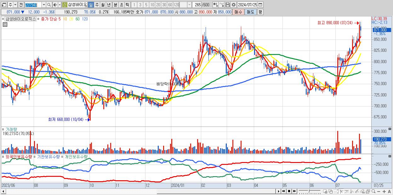 - 삼성바이오로직스 (871,000원 ▼ -1.36% , 시총: 619,926억, 외국인 순매수 거래금:260억)