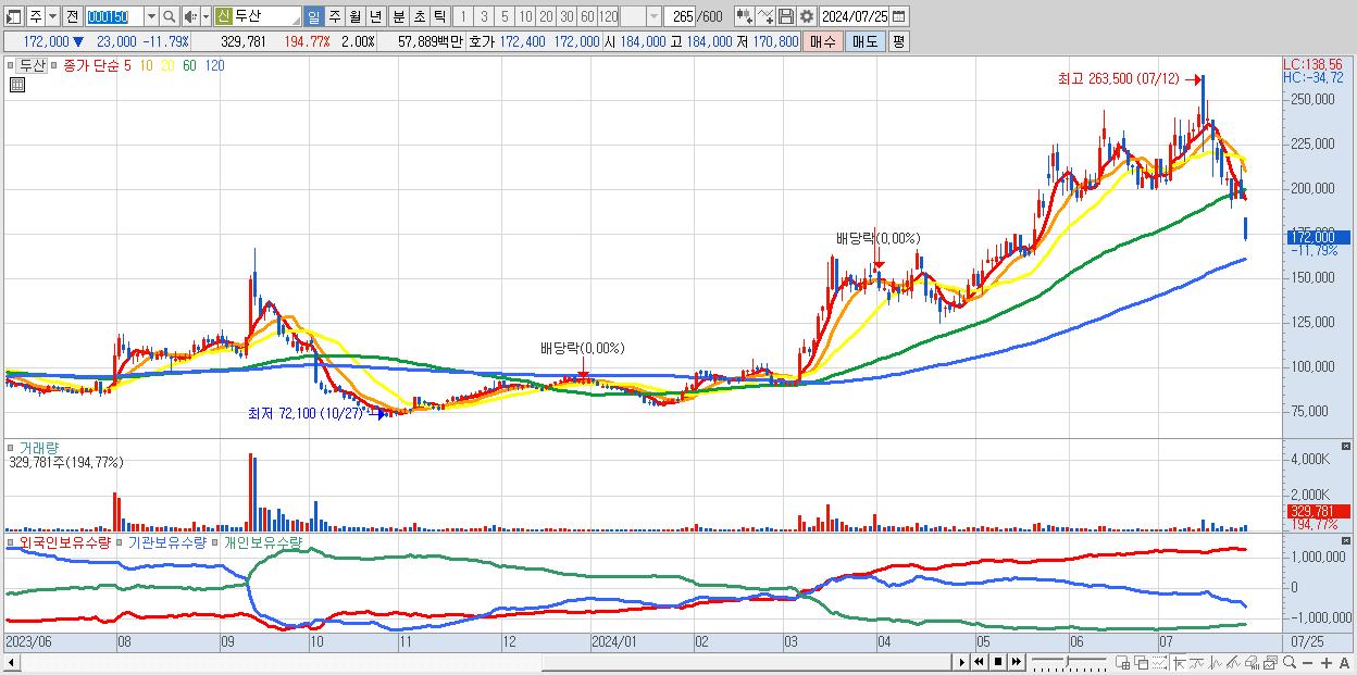 - 두산 (172,000원 ▼ -11.79% , 시총: 28,421억, 외국인 순매수 거래금:111억)