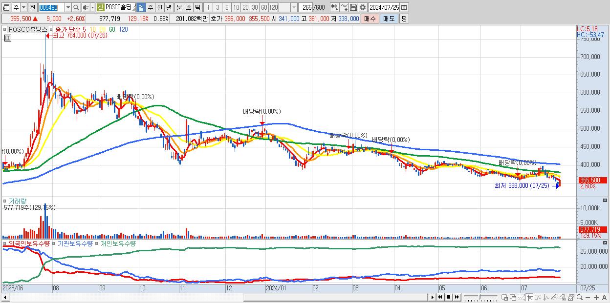 - POSCO홀딩스 (355,500원 ▲ 2.6% , 시총: 300,651억, 외국인 순매수 거래금:172억)