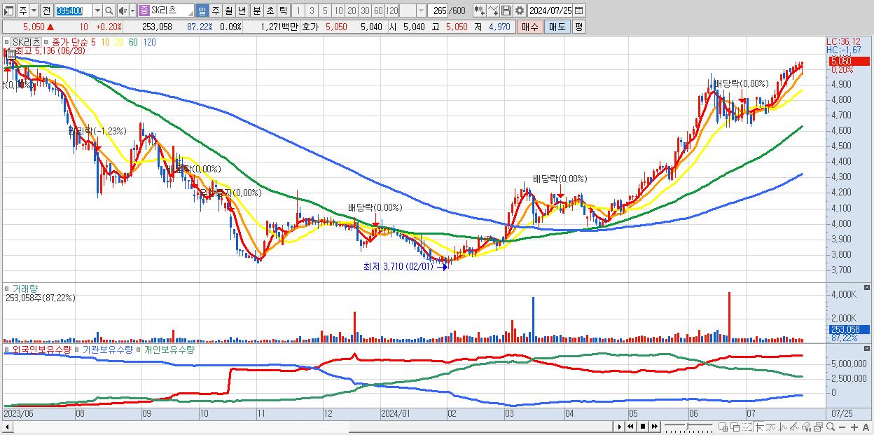 - SK리츠 (5,050원 ▲ 0.2% , 시총: 13,642억, 거래량: 253,058, 거래대금:13억, KOSPI)
