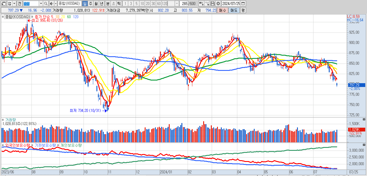| 07/25 | 797.29 | ▼-2.08% | 959억 | -1,395억 | 506억 | -69억 |