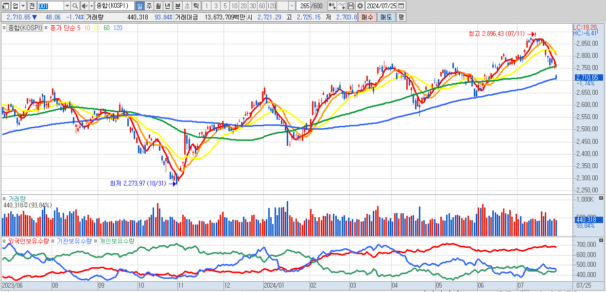 | 07/11 | 2,891.35 | ▲0.81% | -3,476억 | 6,099억 | -849억 | -1,774억 |
