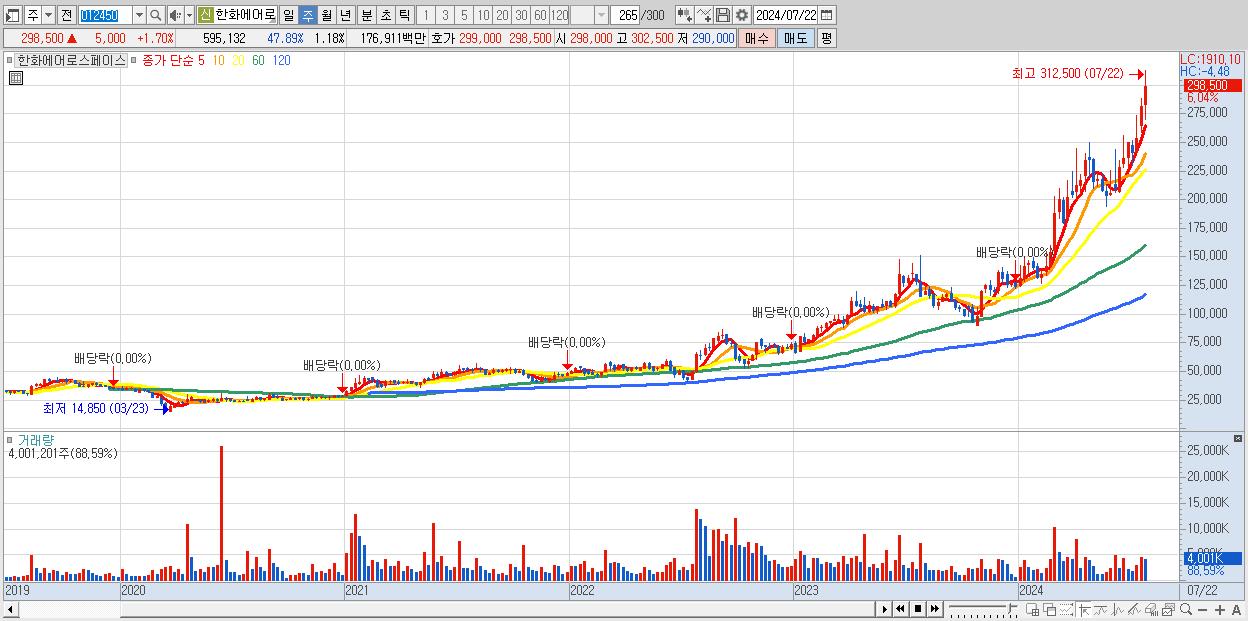 - 한화에어로스페이스 (298,500원 ▲ 6.04% , 시총: 151,131억, 거래량: 4,001,201, 거래대금:11,769억)