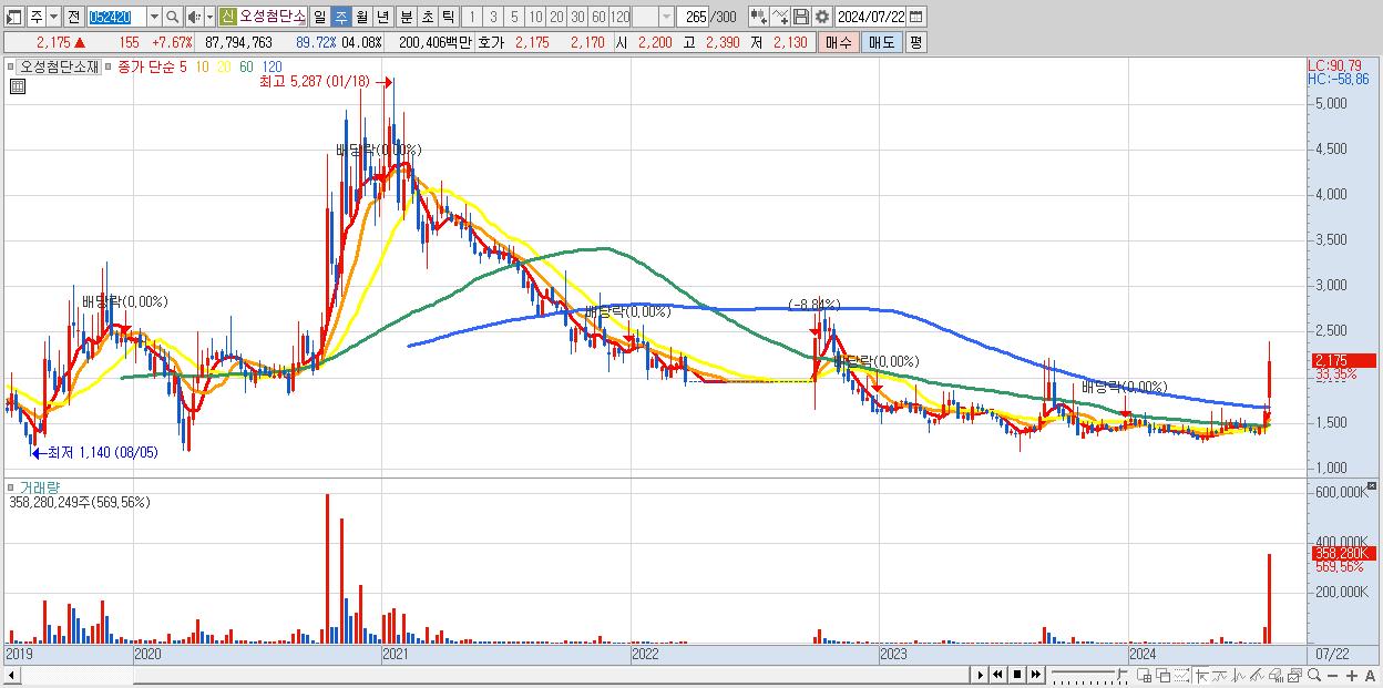 - 오성첨단소재 (2,175원 ▲ 33.35% , 시총: 1,835억, 거래량: 358,280,249, 거래대금:7,288억)