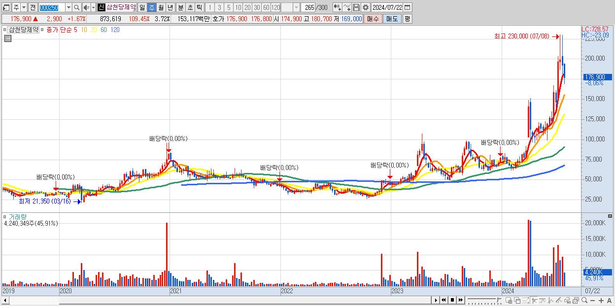 - 삼천당제약 (176,900원 ▼ -8.06% , 시총: 41,496억, 거래량: 4,240,349, 거래대금:7,699억)