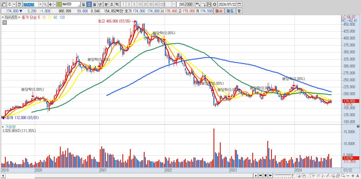 - NAVER (174,800원 ▲ 1.51% , 시총: 283,890억, 거래량: 3,828,869, 거래대금:6,675억)