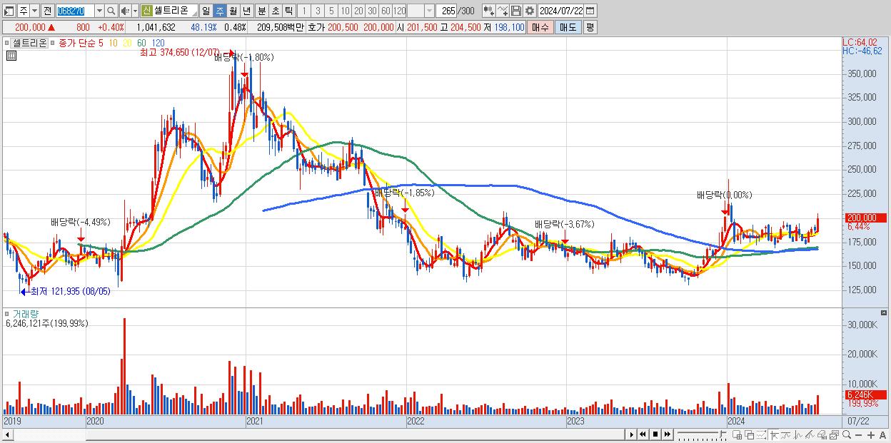 - 셀트리온 (200,000원 ▲ 6.44% , 시총: 433,986억, 거래량: 6,246,121, 거래대금:12,292억)