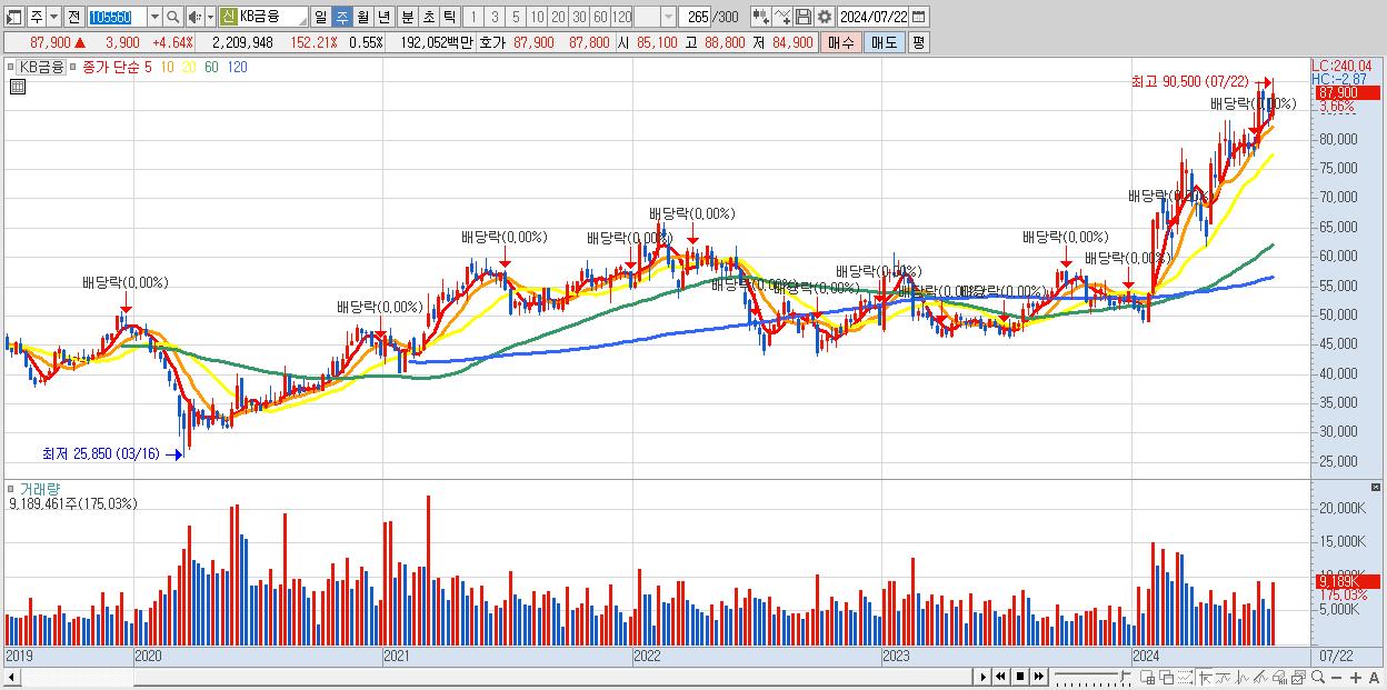 - KB금융 (87,900원 ▲ 3.66% , 시총: 354,686억, 거래량: 9,189,461, 거래대금:7,929억)