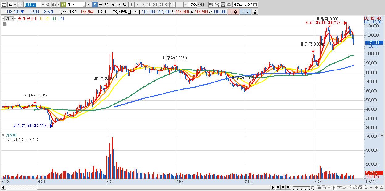 - 기아 (112,100원 ▼ -3.61% , 시총: 448,241억, 거래량: 5,572,835, 거래대금:6,466억)