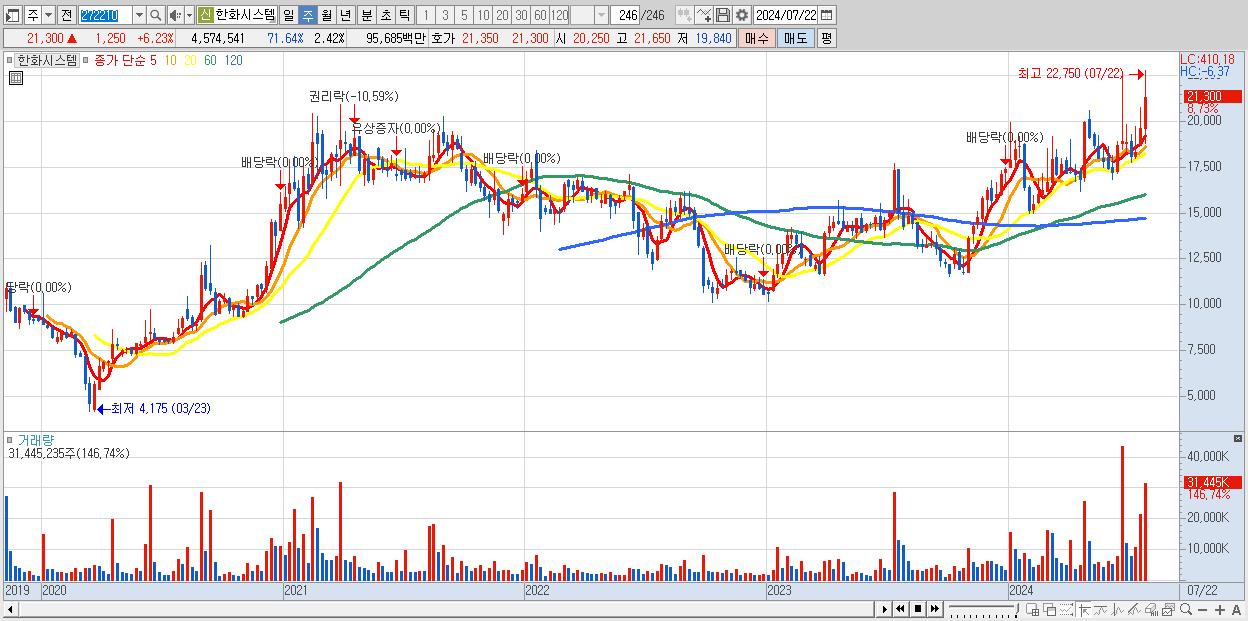 - 한화시스템 (21,300원 ▲ 8.73% , 시총: 40,240억, 거래량: 31,445,235, 거래대금:6,686억)