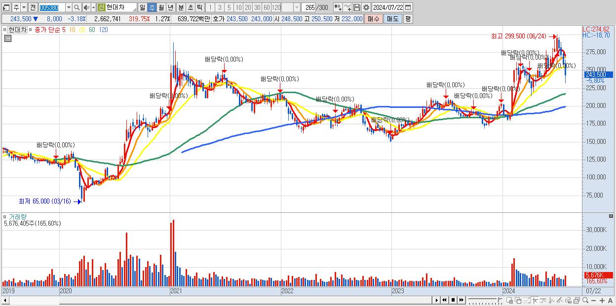 - 현대차 (243,500원 ▼ -5.8% , 시총: 509,928억, 거래량: 5,676,405, 거래대금:14,129억)