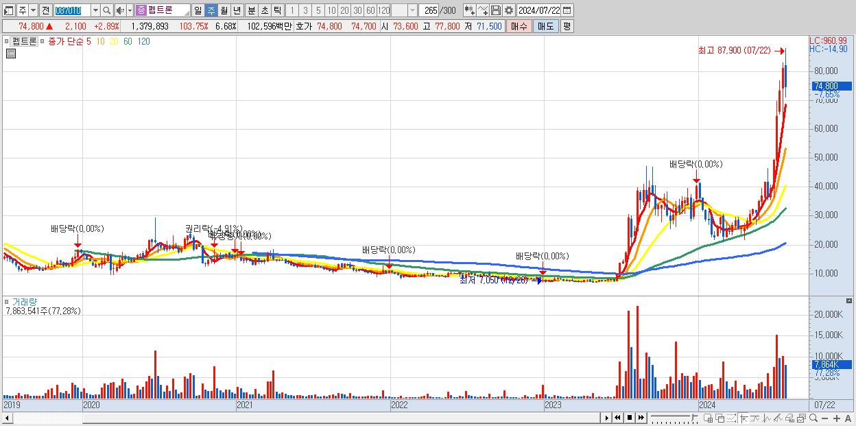 - 펩트론 (74,800원 ▼ -7.65% , 시총: 15,452억, 거래량: 7,863,541, 거래대금:6,190억)