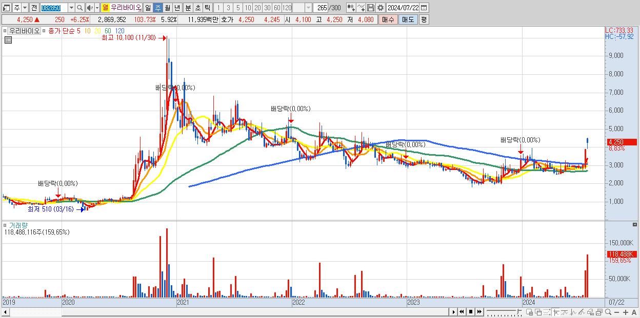 - 우리바이오 (4,250원 ▲ 8.83% , 시총: 2,059억, 거래량: 118,488,116, 거래대금:4,962억)