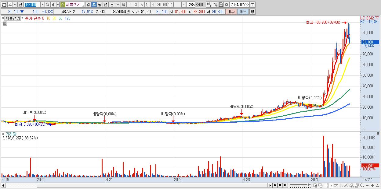 - 제룡전기 (81,100원 ▼ -7.74% , 시총: 13,027억, 거래량: 5,678,612, 거래대금:5,058억)