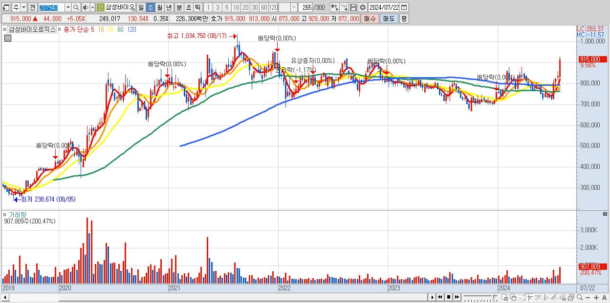 - 삼성바이오로직스 (915,000원 ▲ 9.58% , 시총: 651,242억, 거래량: 907,809, 거래대금:7,981억)