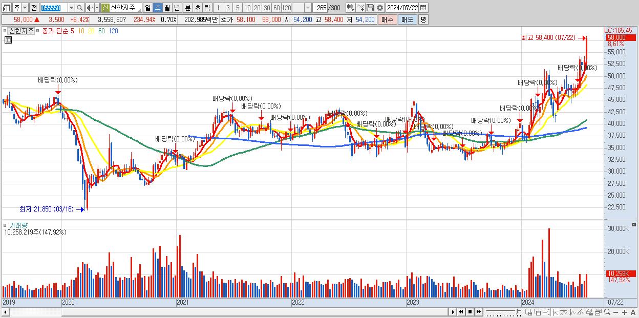 - 신한지주 (58,000원 ▲ 8.61% , 시총: 295,448억, 거래량: 10,258,219, 거래대금:5,718억)
