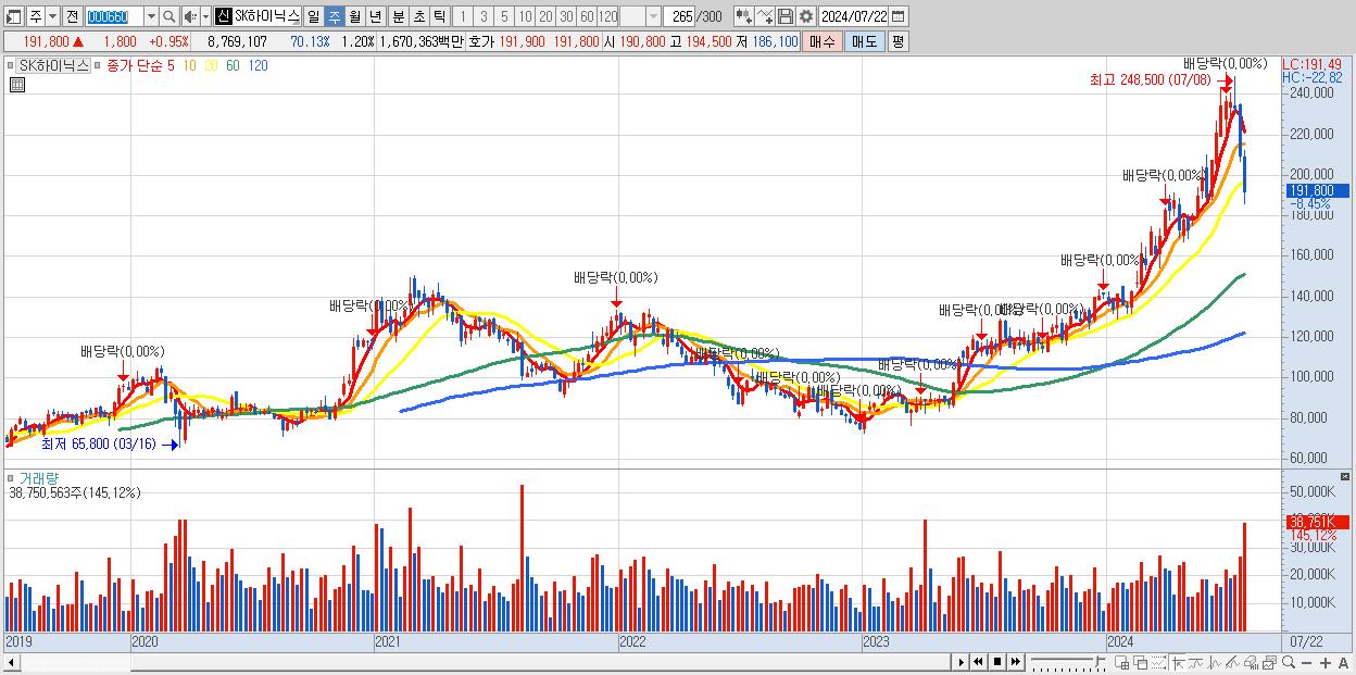 - SK하이닉스 (191,800원 ▼ -8.45% , 시총: 1,396,309억, 거래량: 38,750,563, 거래대금:76,736억)