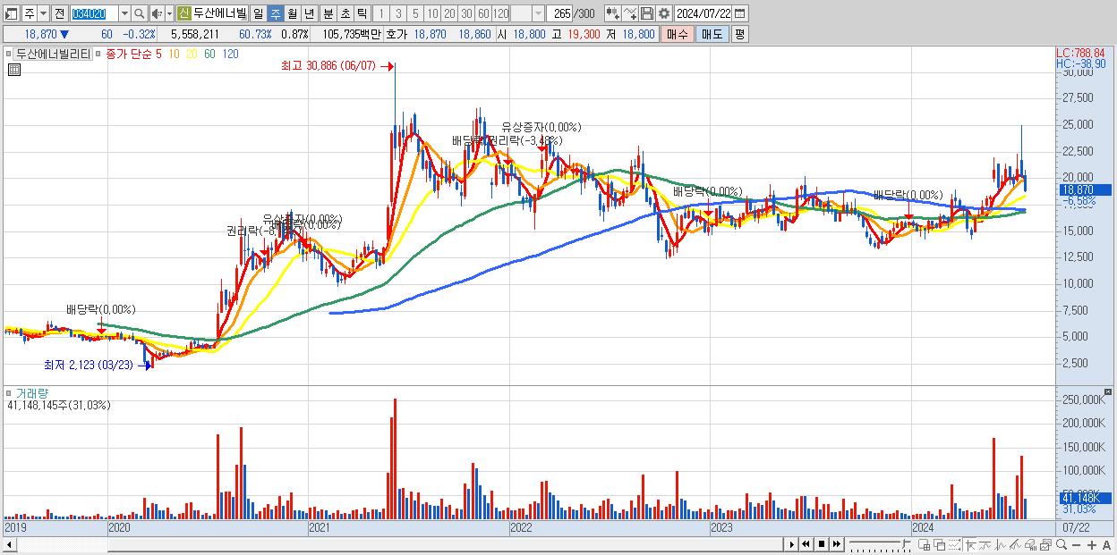 - 두산에너빌리티 (18,870원 ▼ -6.58% , 시총: 120,874억, 거래량: 41,148,145, 거래대금:8,132억)