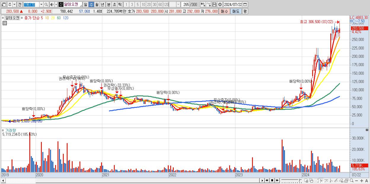 - 알테오젠 (283,500원 ▲ 4.42% , 시총: 150,676억, 거래량: 5,719,234, 거래대금:16,421억)