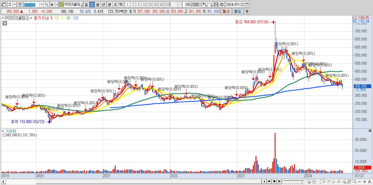 - POSCO홀딩스 (356,500원 ▼ -3.78% , 시총: 301,496억, 거래량: 2,049,545, 거래대금:7,260억)