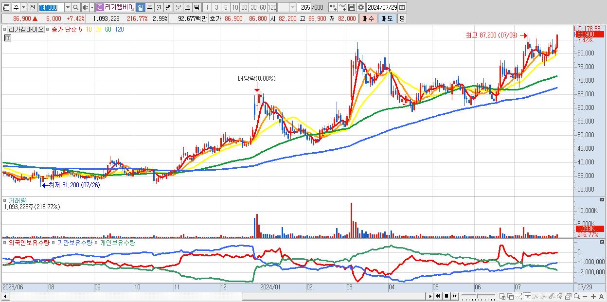 - 리가켐바이오 (86,900원 ▲ 7.42% , 시총: 31,777억, 외국인 순매수 거래금:76억)