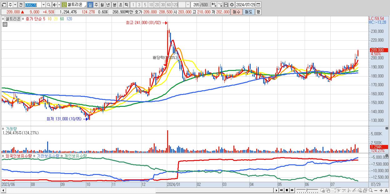 - 셀트리온 (209,000원 ▲ 4.5% , 시총: 453,516억, 외국인 순매수 거래금:216억)