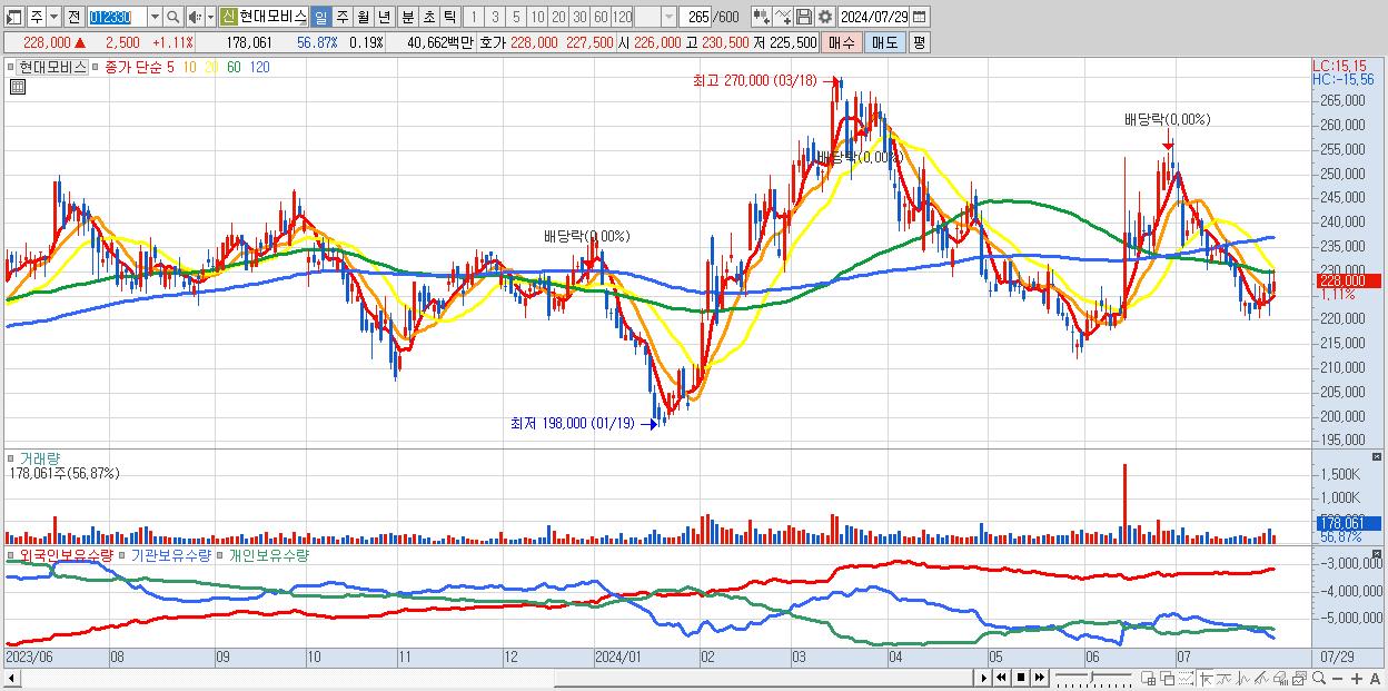 - 현대모비스 (228,000원 ▲ 1.11% , 시총: 212,029억, 외국인 순매수 거래금:132억)