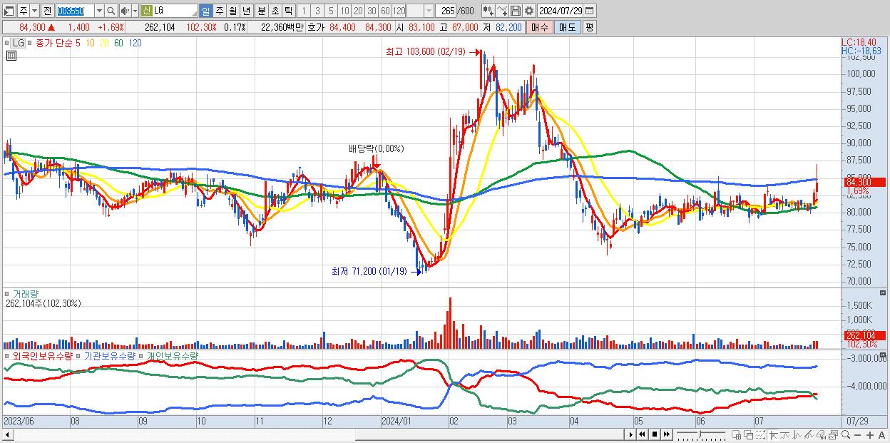 - LG (84,300원 ▲ 1.69% , 시총: 132,605억, 외국인 순매수 거래금:57억)