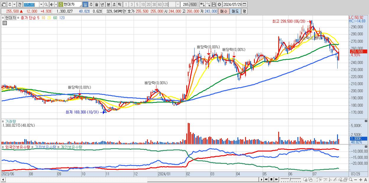 - 현대차 (255,500원 ▲ 4.93% , 시총: 535,058억, 외국인 순매수 거래금:313억)