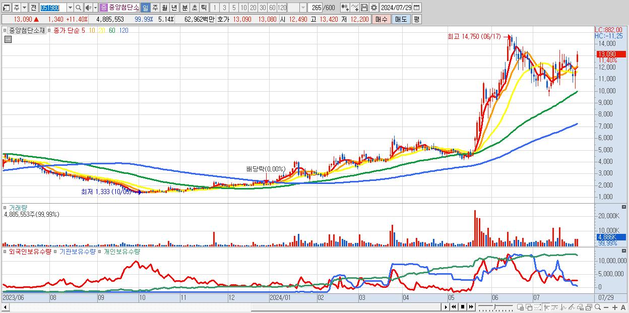 - 중앙첨단소재 (13,090원 ▲ 11.4% , 시총: 12,451억, 외국인 순매수 거래금:63억)