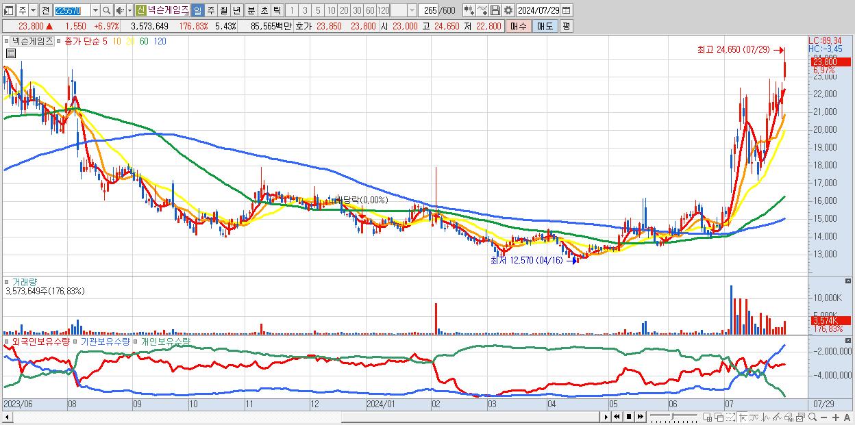 - 넥슨게임즈 (23,800원 ▲ 6.97% , 시총: 15,666억, 외국인 순매수 거래금:53억)