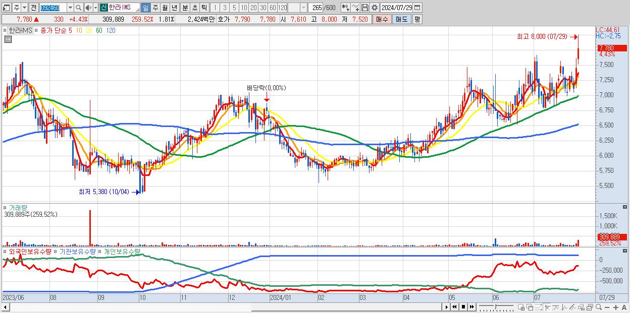 - 한라IMS (7,780원 ▲ 4.43% , 시총: 1,331억, 거래량: 309,889, 거래대금:24억, KOSDAQ)