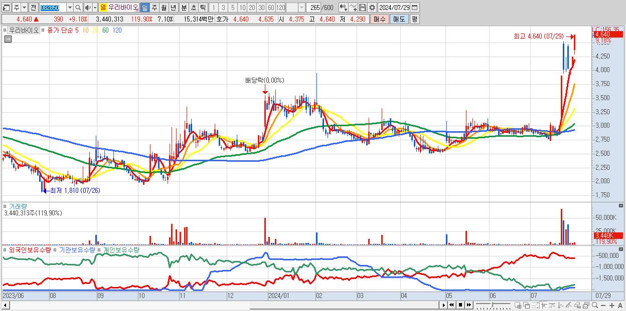- 우리바이오 (4,640원 ▲ 9.18% , 시총: 2,247억, 거래량: 3,440,313, 거래대금:153억, KOSDAQ)