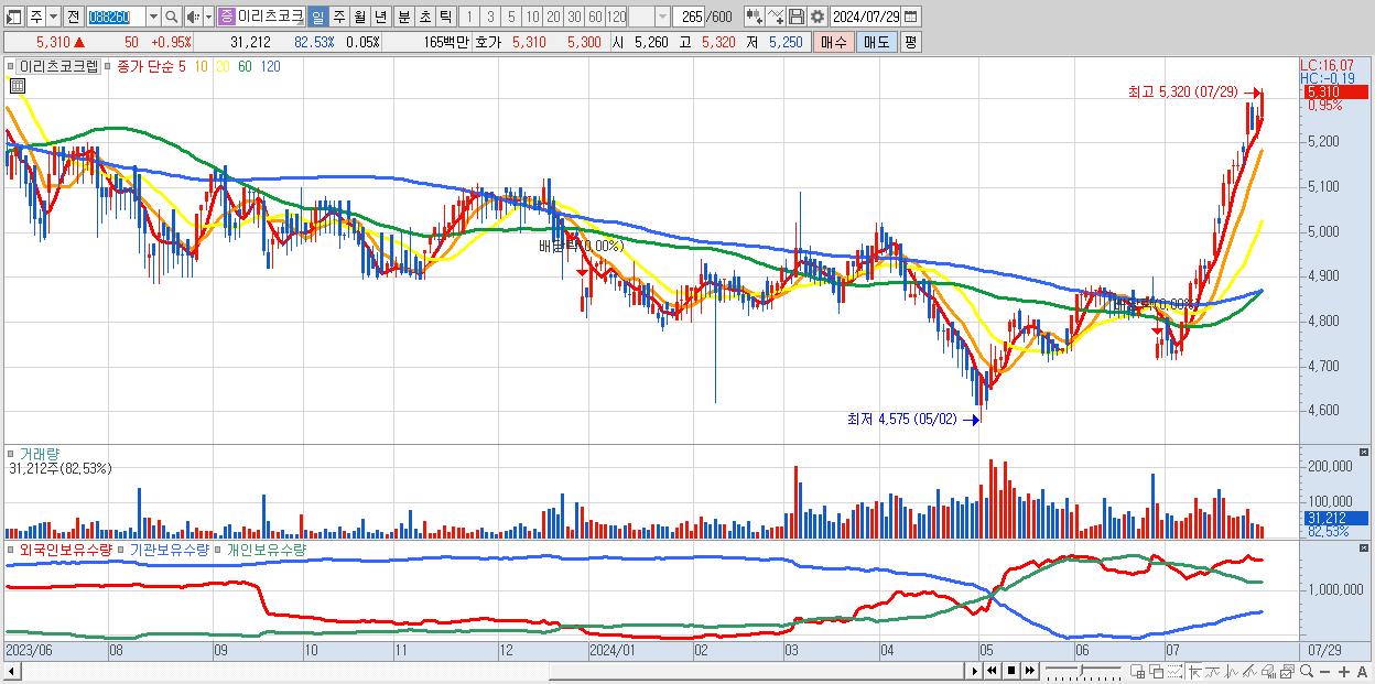 - 이리츠코크렙 (5,310원 ▲ 0.95% , 시총: 3,363억, 거래량: 31,212, 거래대금:2억, KOSPI)