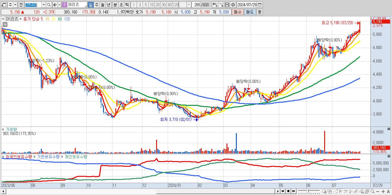 - SK리츠 (5,190원 ▲ 2.37% , 시총: 14,020억, 거래량: 383,260, 거래대금:20억, KOSPI)