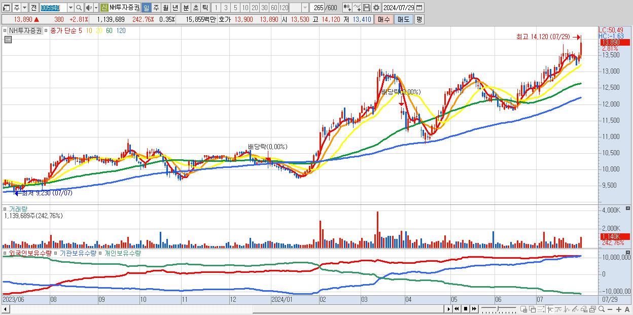 - NH투자증권 (13,890원 ▲ 2.81% , 시총: 45,489억, 거래량: 1,139,854, 거래대금:159억, KOSPI)