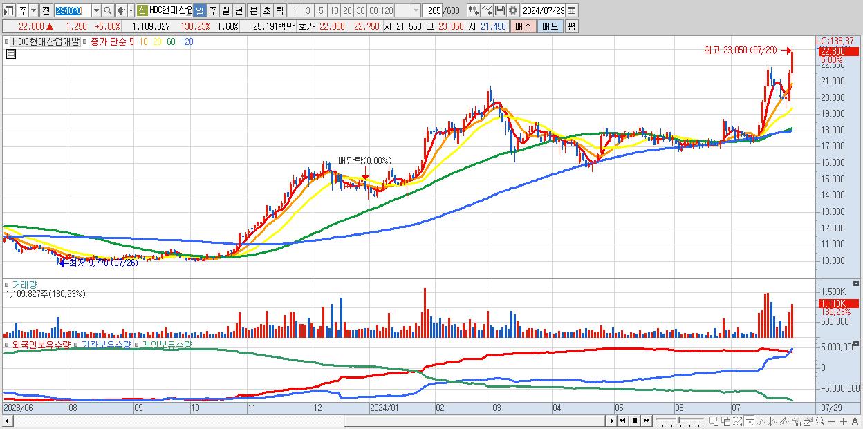 - HDC현대산업개발 (22,800원 ▲ 5.8% , 시총: 15,027억, 거래량: 1,109,875, 거래대금:252억, KOSPI)